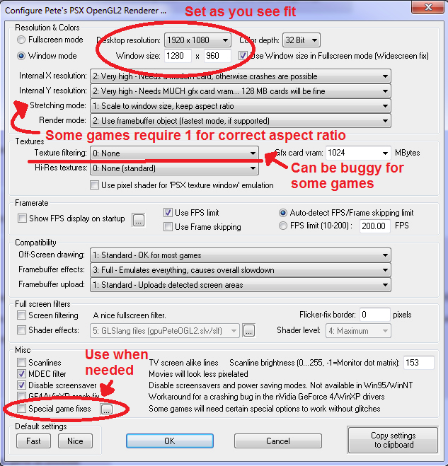 - 3D: PEOPS OpenGL 1.78 - Comes with PCSX-R. Has an anti-jitter function labeled "GTE accuracy", rendering at native screen resolution, Bilinear texture filtering and allows driver-forced AA . Despite being open source this plugin wasn't updated for years either(except FPSE version) and cant use shaders like Pete's OpenGL2 and gpuBladeSoft. There is also optimized, modified and enhanced versions of this plugin in active development which can currently be used only by FPSE.
